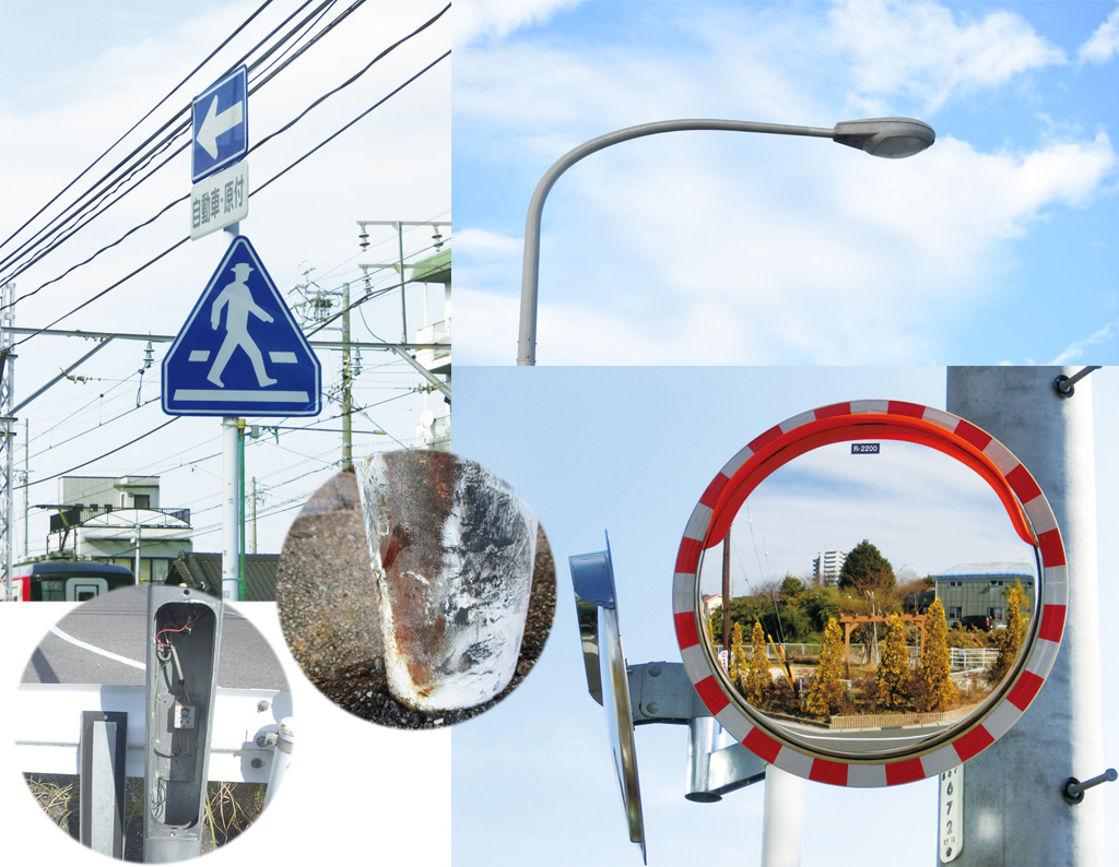 せっかく設置した道路反射鏡(カーブミラー)も正常に見えなければ意味がありません。運転者視点での映り込み写真や映り込み障害要因などのデータ管理で施設の腐食の状態だけでなく実際に機能を果たしているかをチェックし、出会い頭事故を防止します。